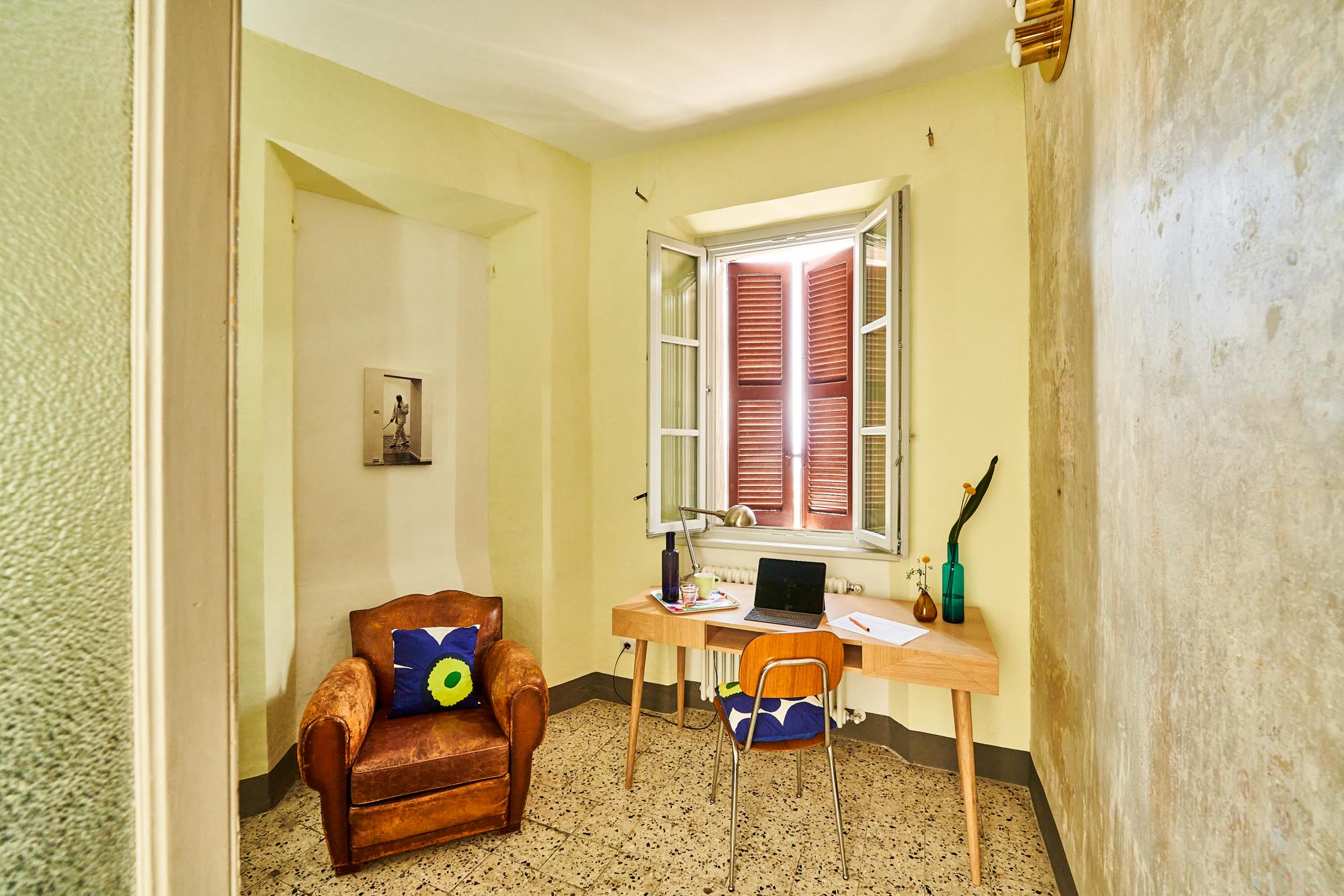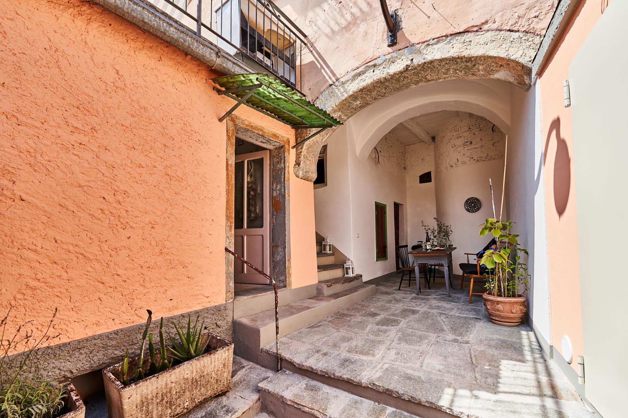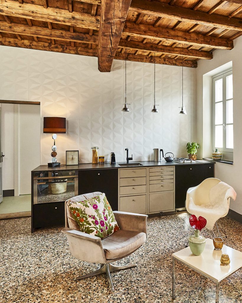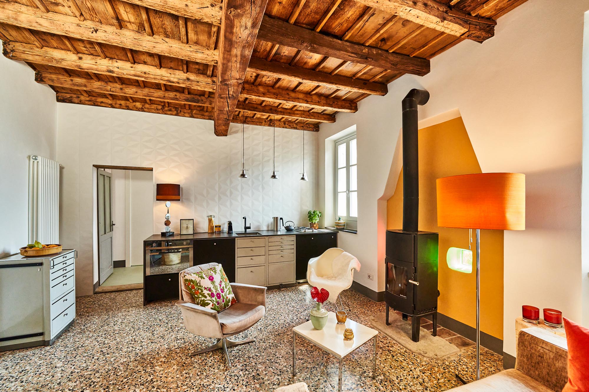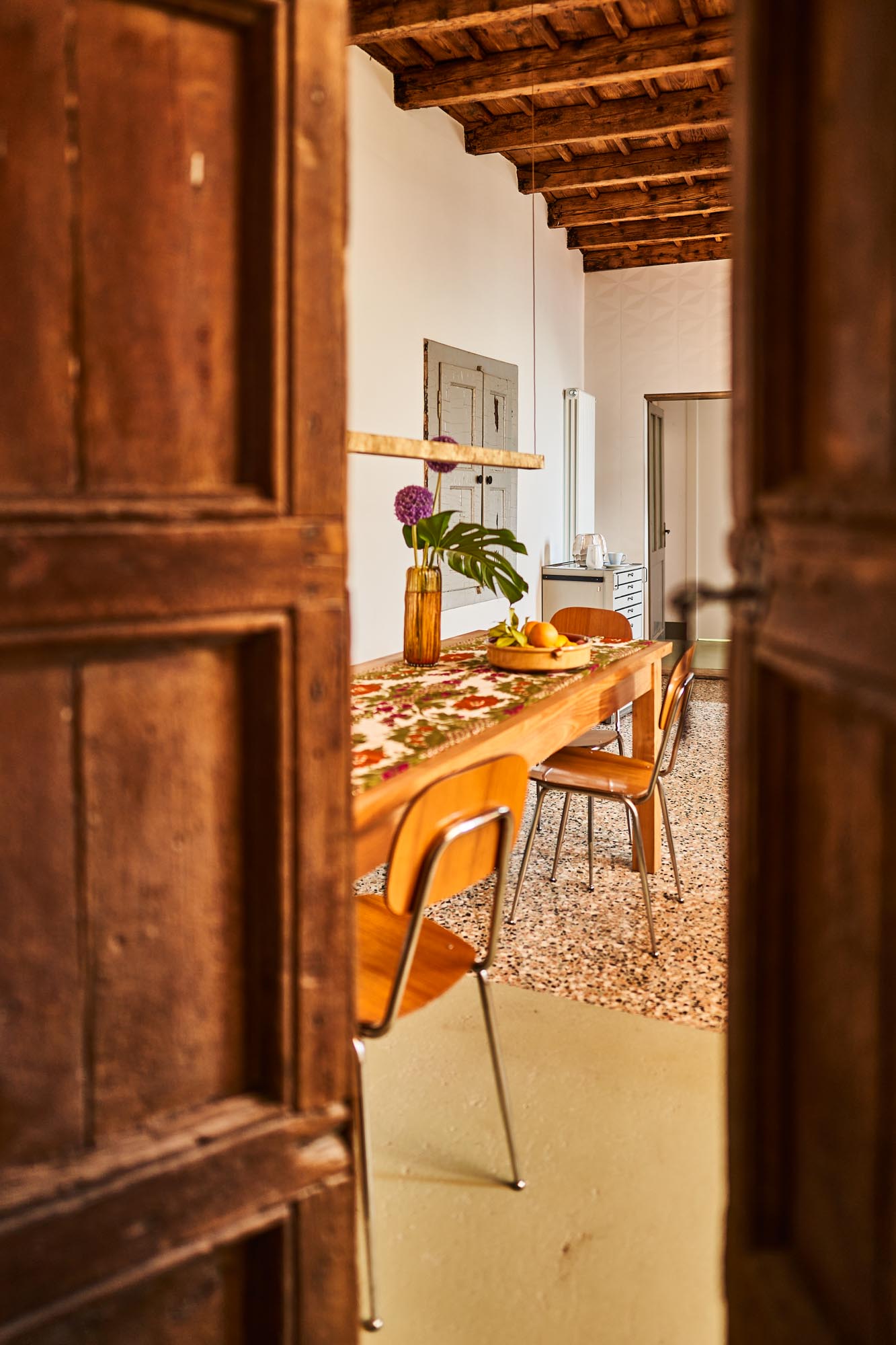 Der Grundriss wurde modernisiert, aber wir haben stets darauf geachtet, die historischen Merkmale zu bewahren. Über einen idyllischen Patio betritt man das historische Treppenhaus und gelangt in den ersten Stock. Dort haben wir den Raum geöffnet, die sensationelle Holzdecke freigelegt und restauriert. Der Terrazzoboden stammt vermutlich aus den 40er Jahren des letzten Jahrhunderts und bringt einen authentischen, zeitlosen Charme in den Raum.