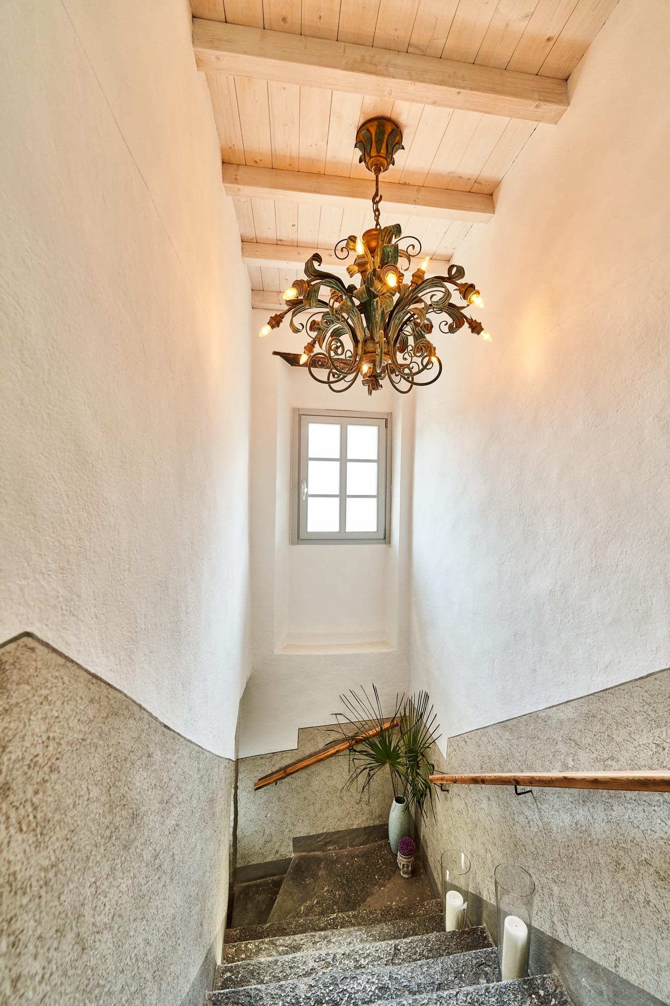Vom Wohnzimmer führt eine Tür in unser privates Schlafzimmer, das wir nicht vermieten. Dafür stehen jedoch drei gemütliche Zimmer im Obergeschoss zur Verfügung, die durch eine historische Steintreppe erreichbar sind. Ein Riesen-Metall-Kronleuchter im Treppenhaus bringt festliche Eleganz in das Gebäude.