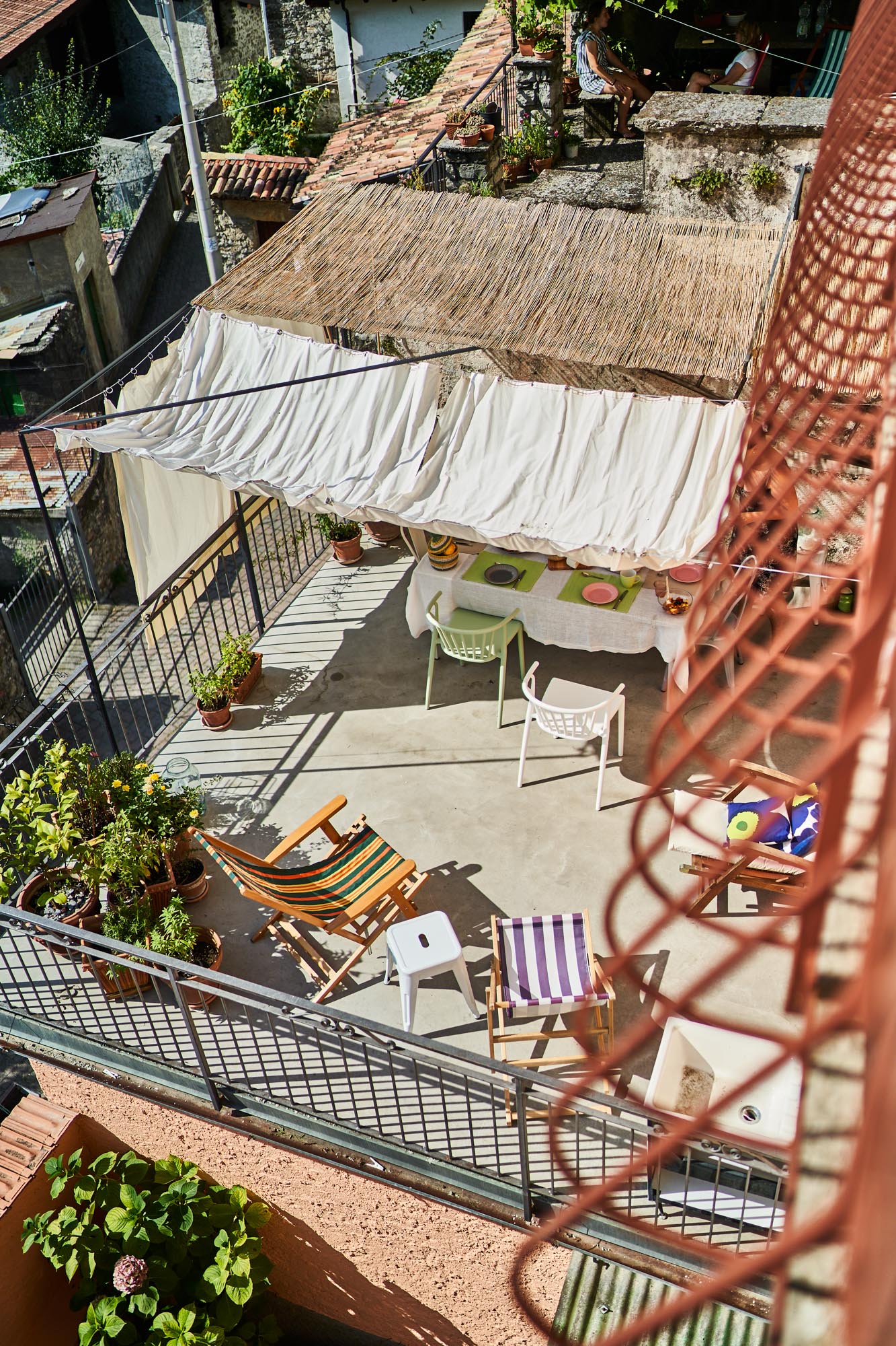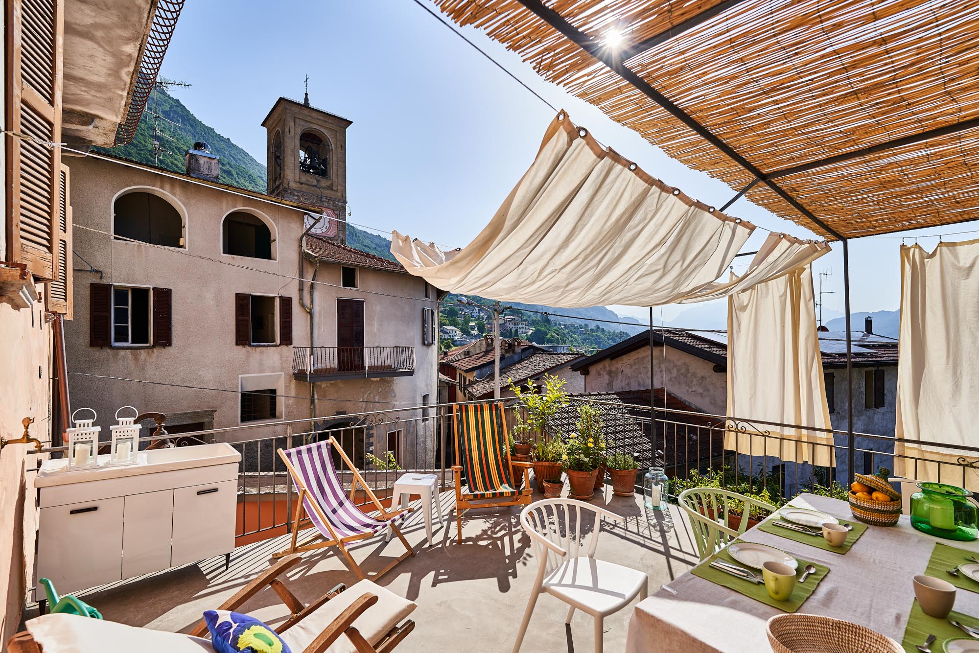 Über der Siebdruckwerkstatt befindet sich eine wunderbare Terrasse, die einen gigantischen Blick auf den Piano See, die umliegenden Berge und das Dorf mit seinem alten Kirchturm bietet. Der Klang des Kirchturms, wenn er läutet, ist nicht zu überhören und gehört zur Atmosphäre dieses bezaubernden Ortes.
